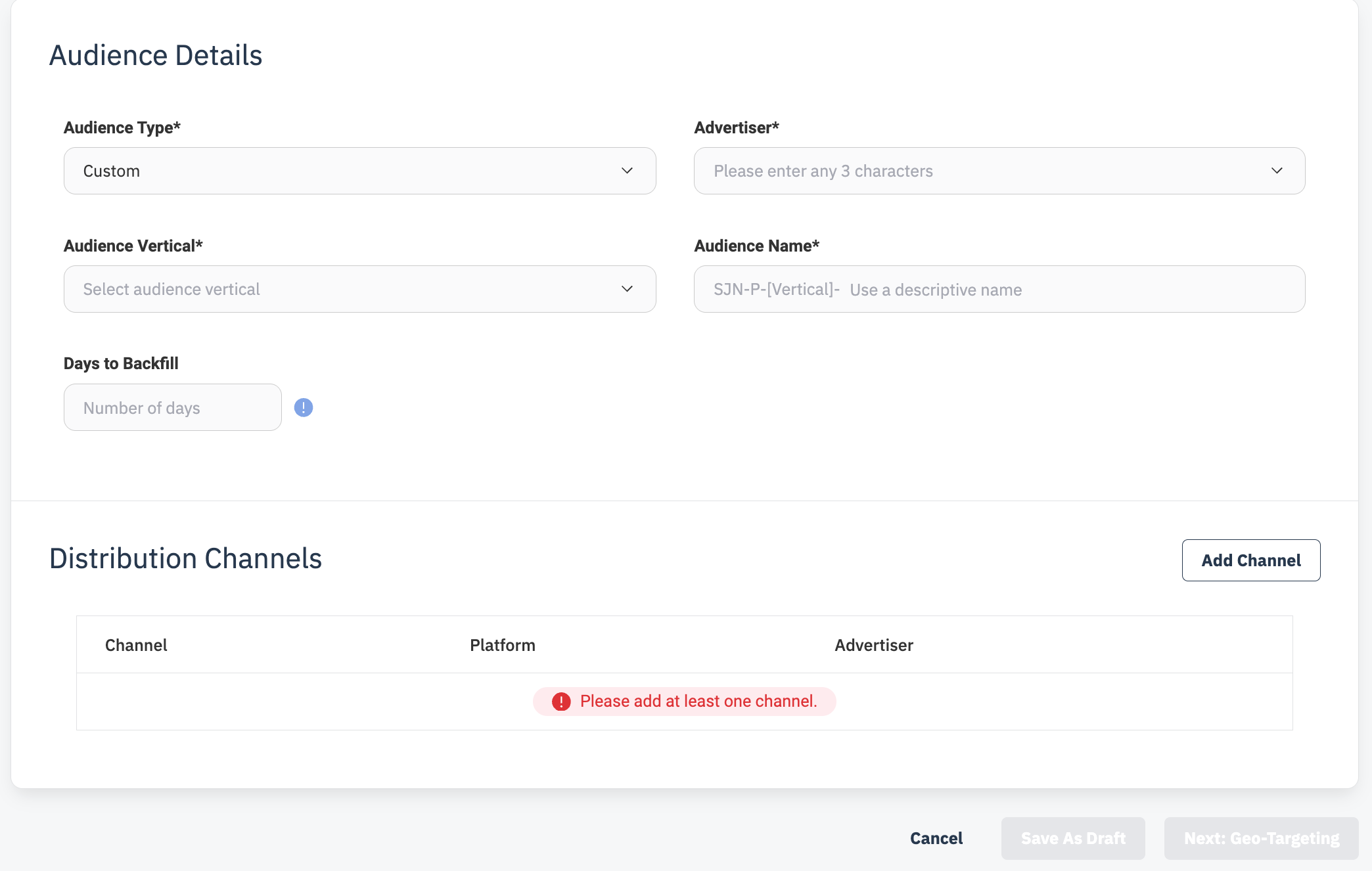 Distribution Channels: Click the Add Channel button and select the appropriate DSP. If you are creating a custom advertiser audience, select the relevant DSP advertiser.