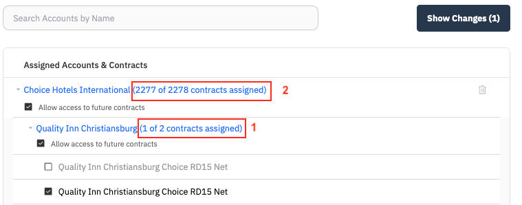 Note: If you don't see an expansion icon next to an account, it means the account currently has no contracts. However, if the 'Allow access to future contracts' box is checked, the user will automatically gain access to any new contract created.