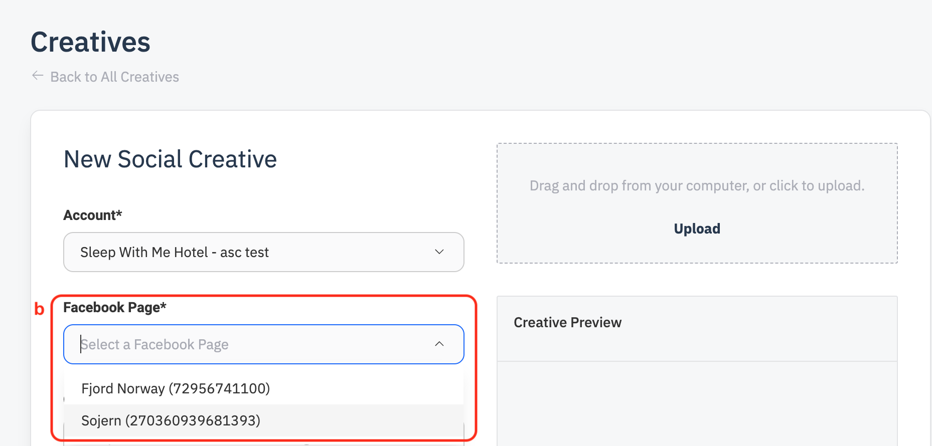 When setting up your creatives, you will be able to assign the Page ID from the dropdown (b).