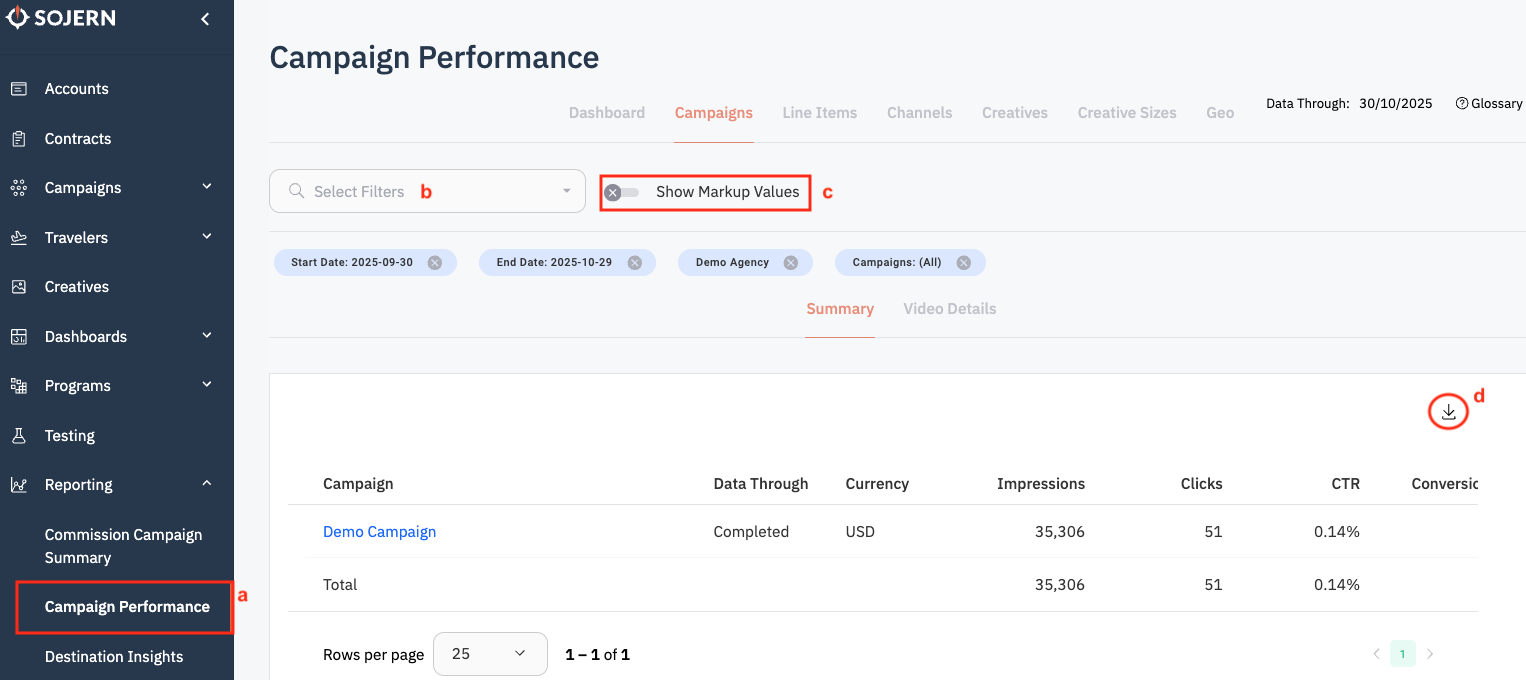 4 - To export data, click the download icon (d) in the top-right corner. The CSV export will include a Markup Type column with values of Gross or Net per campaign.